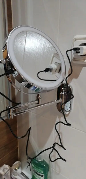 Yes. The USB charging port accepts power banks or bathroom USB outlets so the mirror stays lit during travel or when outlet access is limited.