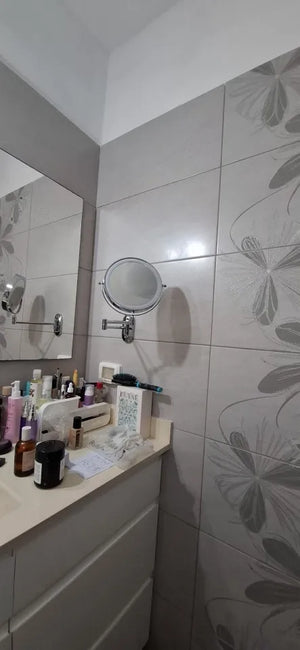 One side is a regular mirror and the other offers 5x magnification. Flip to 5x for close inspection of beard lines, ingrown hairs, or skincare detail.